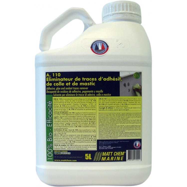 Le A. 110 de Matt Chem est un nettoyant liquide destiné à l’élimination des traces d’adhésifs, de colles, de mastics et de marques de lustrant sur les surfaces des bateaux. Il se présente sous forme d’un liquide fluide, incolore, non miscible à l’eau, avec une densité supérieure à 1. Sa formulation permet de dissoudre efficacement les résidus de colle tout en assurant une action de dégraissage sur les huiles, cires et graisses incrustées. Le produit est compatible avec le gelcoat, les surfaces peintes à base de peintures époxydiques ou polyuréthanes, les semi rigides en PVC, hypalon ou néoprène, les plastiques ainsi que les métaux et ensembles mécaniques ou électromécaniques. Le A. 110 ne contient pas de solvants halogénés ni d’hydrocarbures d’origine pétrolière.