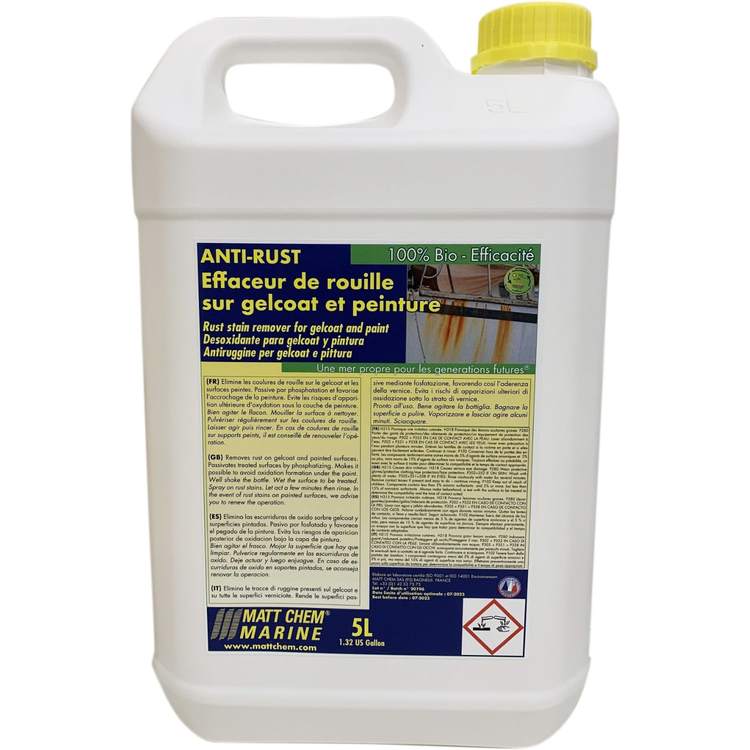 Anti Rust est un produit liquide prêt à l’emploi destiné à l’élimination des coulures de rouille sur le gelcoat et les surfaces peintes des bateaux de plaisance. Il agit par réaction chimique de nature acide et passive les surfaces traitées par phosphatation. Cette action prépare le support et favorise l’accrochage des peintures lors des opérations de reprise. Le produit est incolore, sans ajout de colorant, et présente un aspect limpide. Sa masse volumique est de 1055 g par litre avec une tolérance de plus ou moins 20 g par litre. Anti Rust est ininflammable, ce qui facilite son utilisation à bord ou à quai dans un cadre professionnel.
