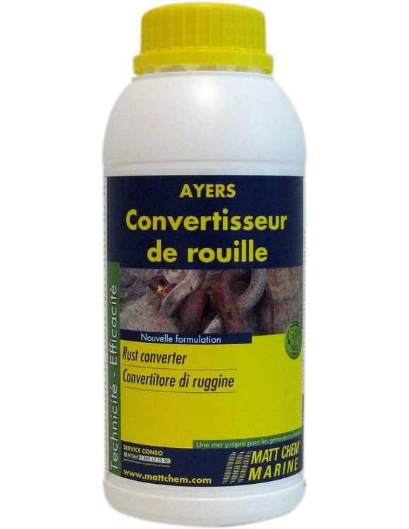 Ayers est un désoxydant neutralisant de rouille destiné aux métaux oxydés en environnement marin. Il agit par réaction chimique directe avec le métal grâce à une formulation à base de composés végétaux réducteurs, de polymères, de solvants couplants émulsionnants et d’agents désoxydants. Le produit se présente sous forme de liquide visqueux, d’aspect opaque laiteux, de couleur brune, avec une odeur faible de résine. La réaction est de type acide non corrosif. Ayers peut être appliqué sur supports humides et n’est pas classé comme substance ou préparation dangereuse. Après réaction, il laisse un revêtement noir et assure une protection contre la réapparition rapide de l’oxydation pendant plusieurs mois.