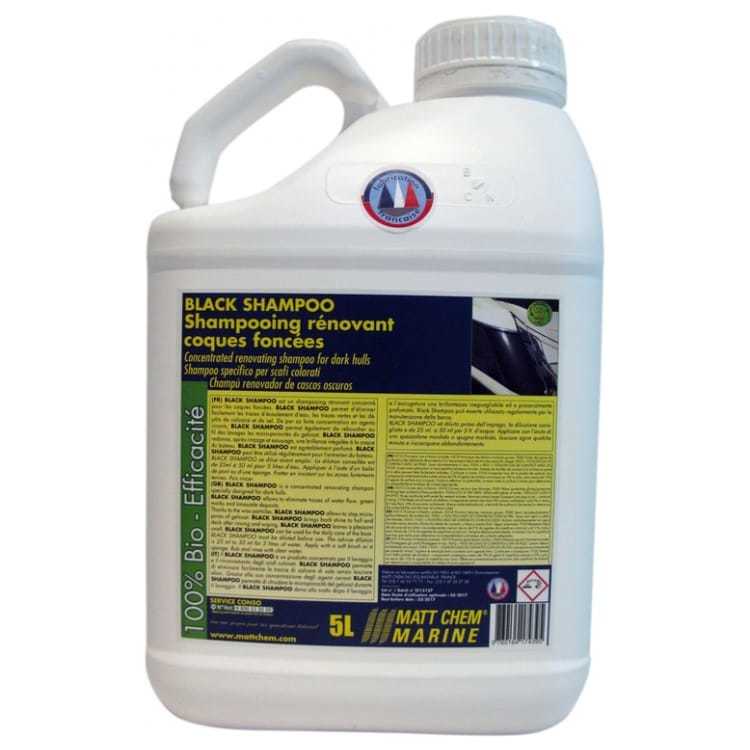 Black Shampoo de Matt Chem est un shampoing rénovant concentré destiné aux coques de couleur foncée. Sa formulation liquide visqueuse, de couleur bleue nuit, agit sur les traces d’écoulement d’eau, les traces vertes ainsi que les dépôts de calcaire et de sel. Sa réaction chimique est pratiquement neutre, ce qui permet un usage régulier sur le gelcoat. Sa forte concentration en agents cirants agit au fil des lavages sur les micro-porosités du gelcoat, limitant l’accroche des salissures. Après rinçage et essuyage, la surface retrouve un aspect brillant. Le produit est parfumé et se dilue avant emploi à raison de 5 bouchons pour 5 litres d’eau. Disponible en bidon de 1 litre ou 5 litres, DLUO annoncée à 3 ans.