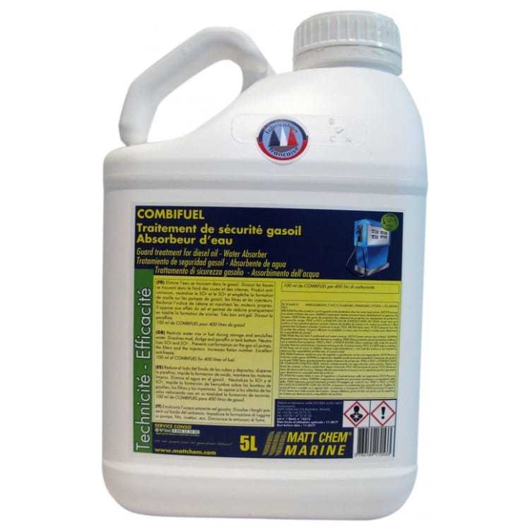 Combifuel de Matt Chem est un additif de sécurité destiné au gasoil utilisé en plaisance. Ajouté directement dans le réservoir, il agit comme émulsifiant en fractionnant l’eau présente dans le carburant en particules fines. Cette eau est ensuite consommée avec le gasoil lors de la combustion. Le produit possède aussi une fonction dispersante qui dissout les boues et gommes accumulées dans le fond des cuves. Il neutralise les composés soufrés SO2 et SO3, limite la corrosion et contribue au maintien de la propreté du circuit carburant. Il renforce l’indice de cétane, abaisse le point de congélation jusqu’à -20°C et dissout la paraffine. Sa formulation est chimiquement neutre, avec une masse volumique de 860 g/l +/- 20 g/l, un point d’éclair de 63°C selon la méthode afnor coupe fermée, un aspect liquide de couleur marron et une odeur caractéristique d’hydrocarbure.